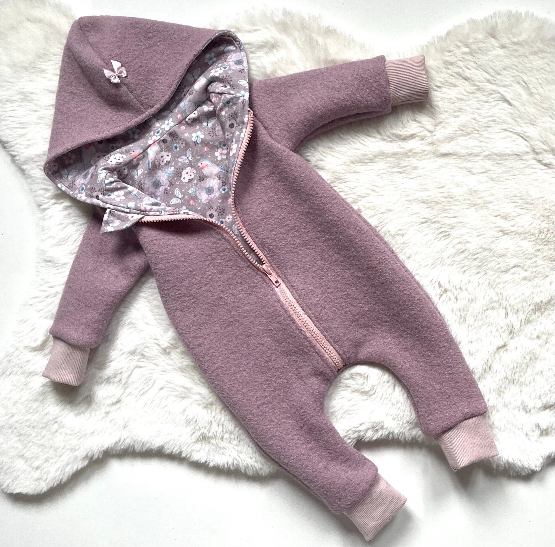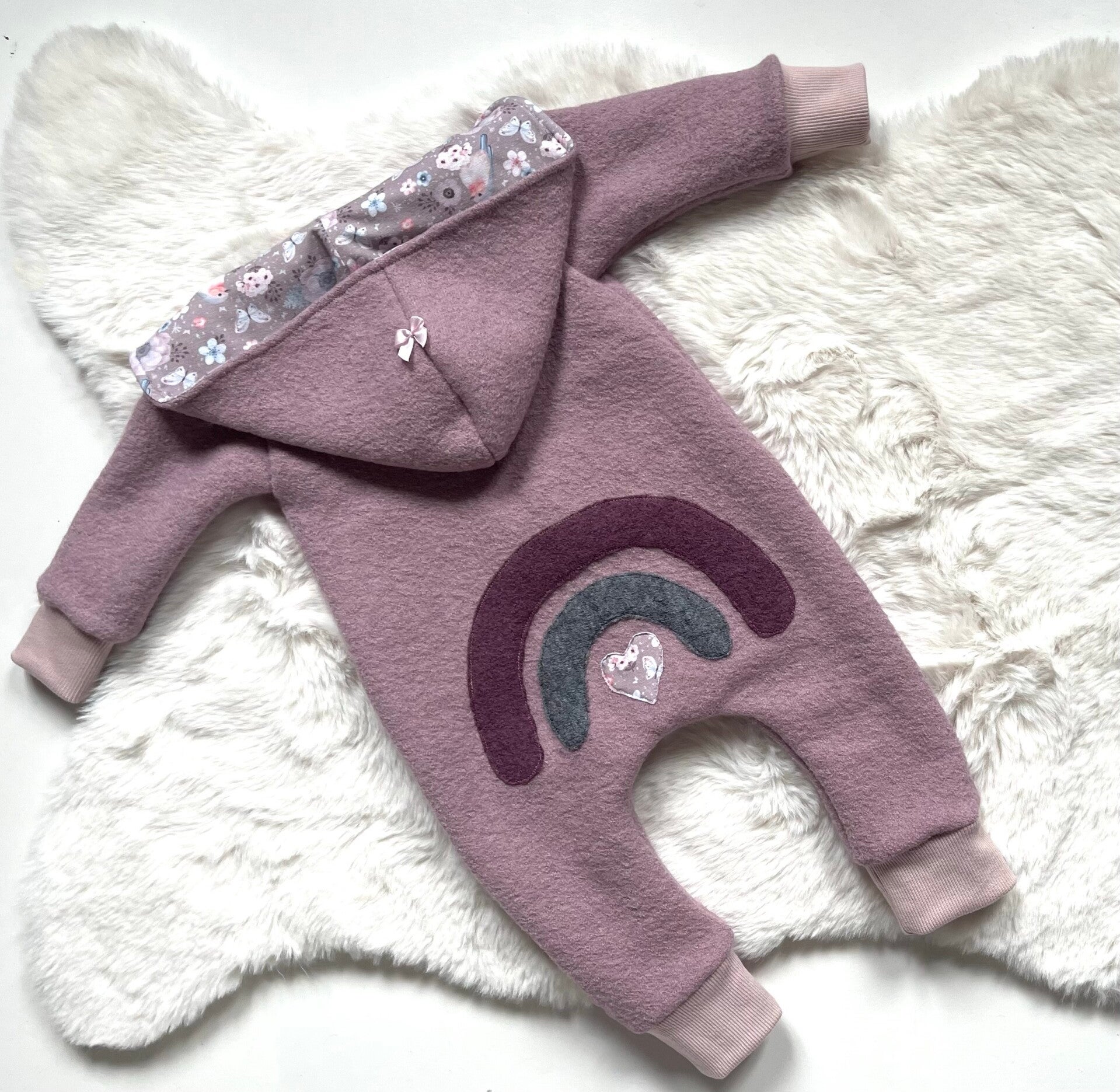 Walkoverall mit Reißverschluss und hinten mit süßer Regenbogenapplikation und kleinen Schleife an der Kapuze in Gr. 62