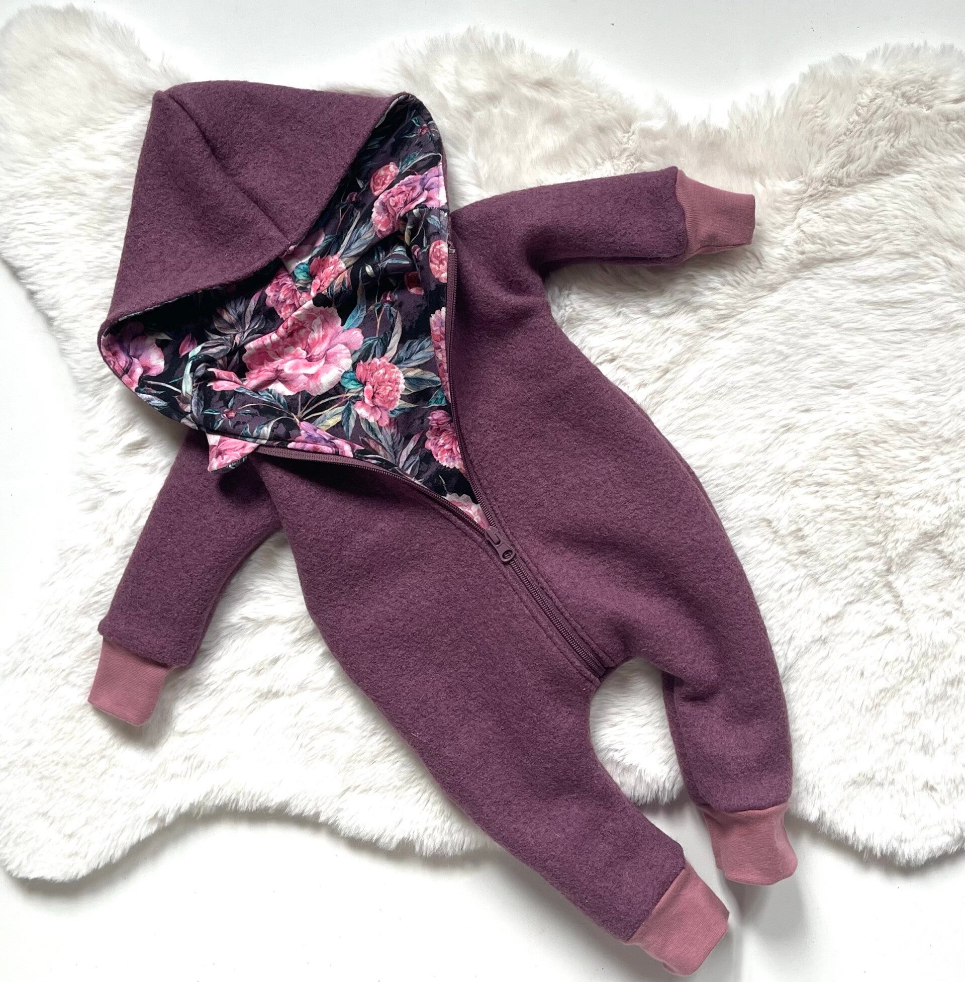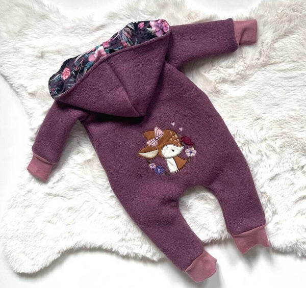 Walkoverall mit Reißverschluss und hinten mit süßer Regenbogenapplikation in Gr. 62 Außen Walk (100% Schurwolle) und Innen aus Jersey (92% Baumwolle, 8% Elasthan)